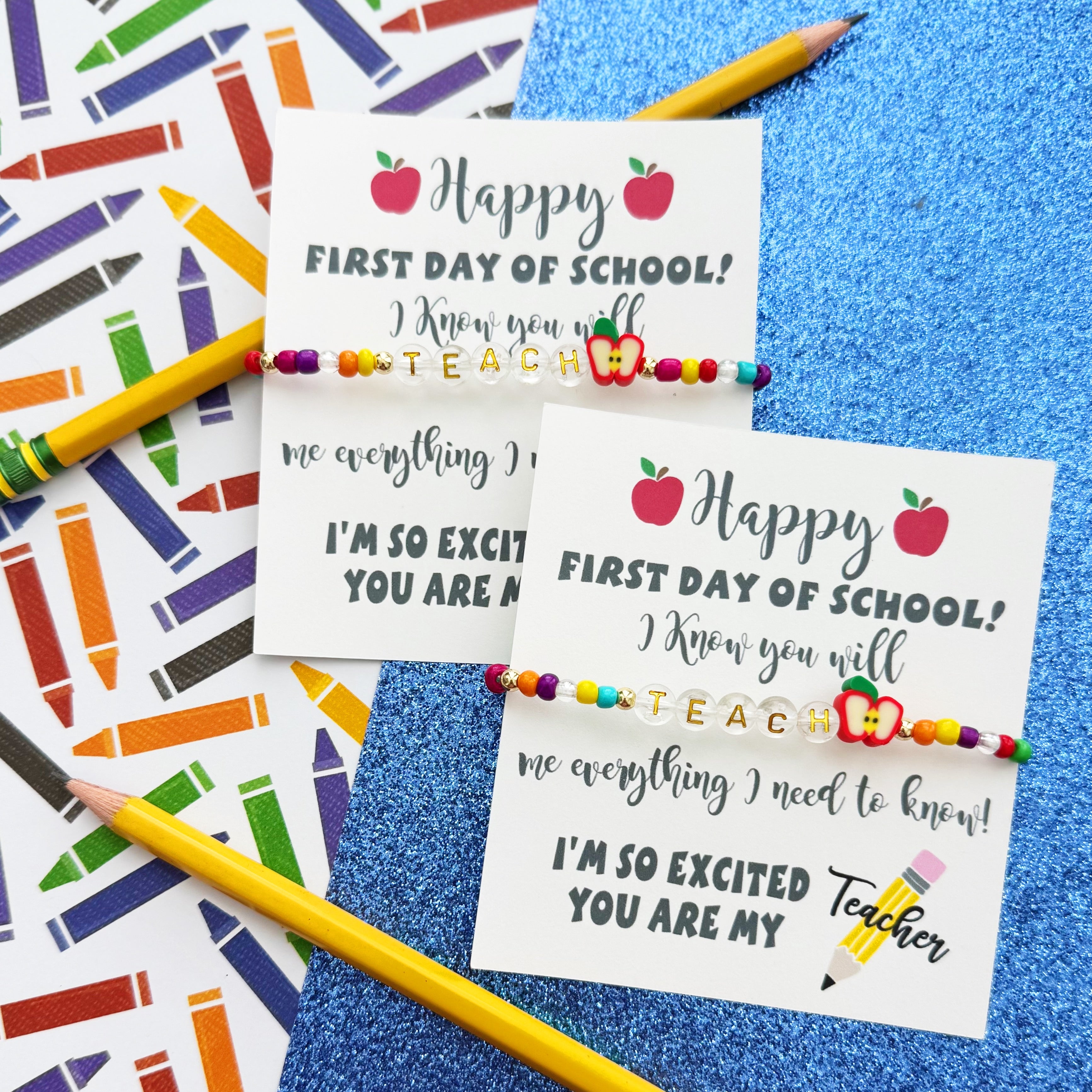 Give your new teachers a sweet First Day of School gift! This Teach bracelet is paired with a cute card to complete the gift!
