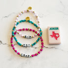 Mahjong has taken the world by storm! Everywhere you look someone is playing or talking about this super fun game. Matching your style to your favorite tile set is a must! This bracelet set is inspired by My Fair Mahjong's tile set The Texas Series Rodeo Pink.