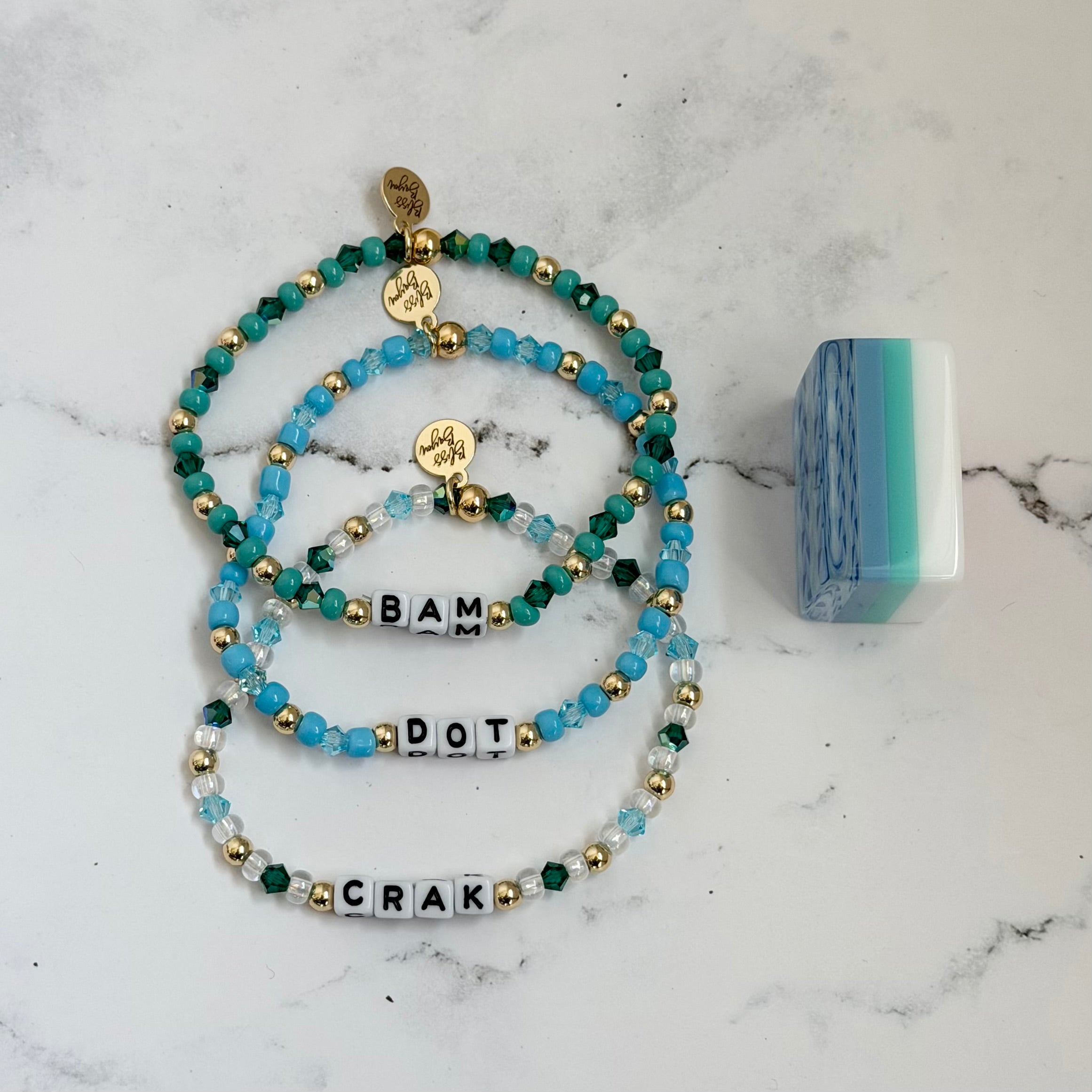 Mahjong has taken the world by storm! Everywhere you look someone is playing or talking about this super fun game. Matching your style to your favorite tile set is a must! This bracelet set is inspired by My Fair Mahjong's tile set Crystal Prism Blue.